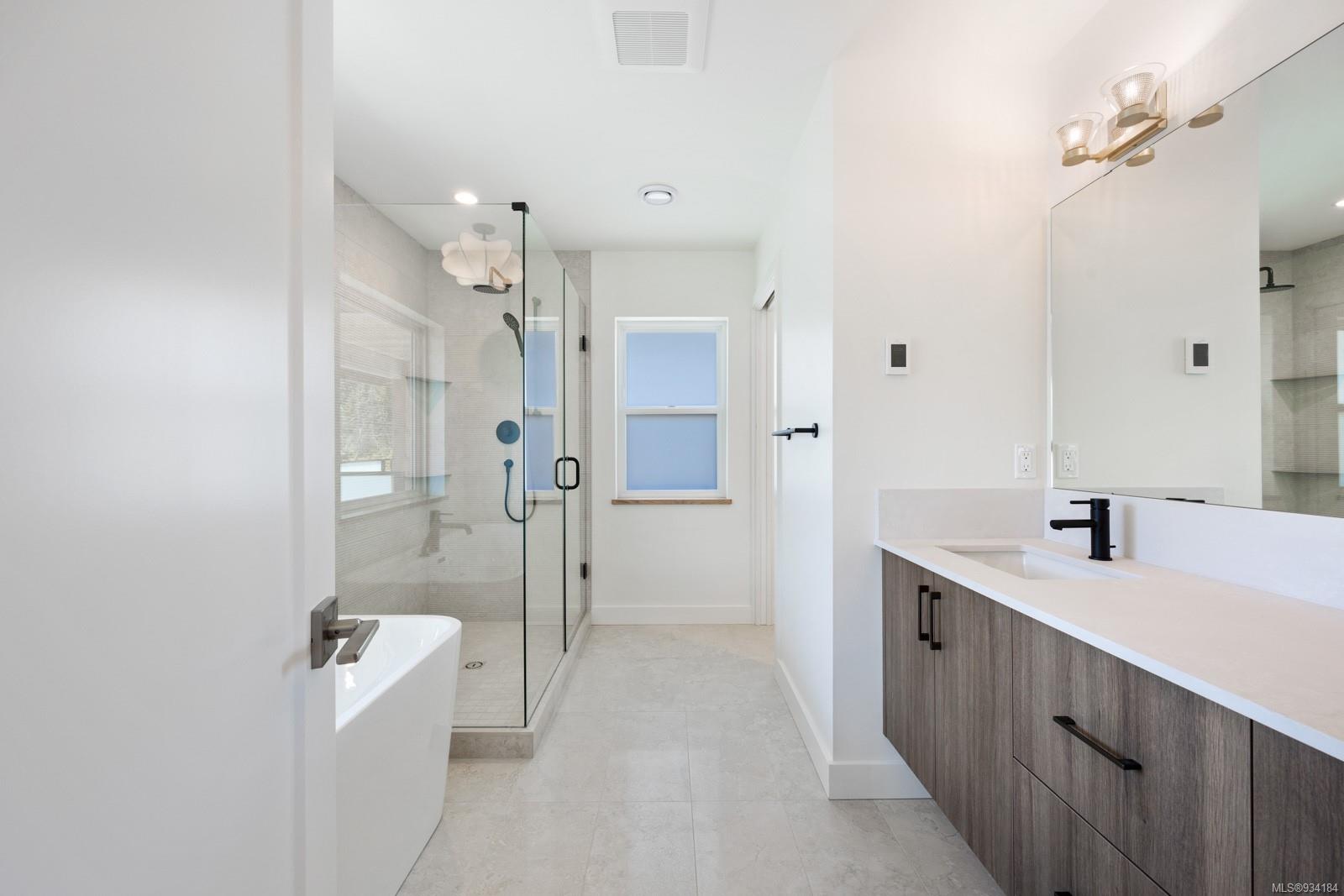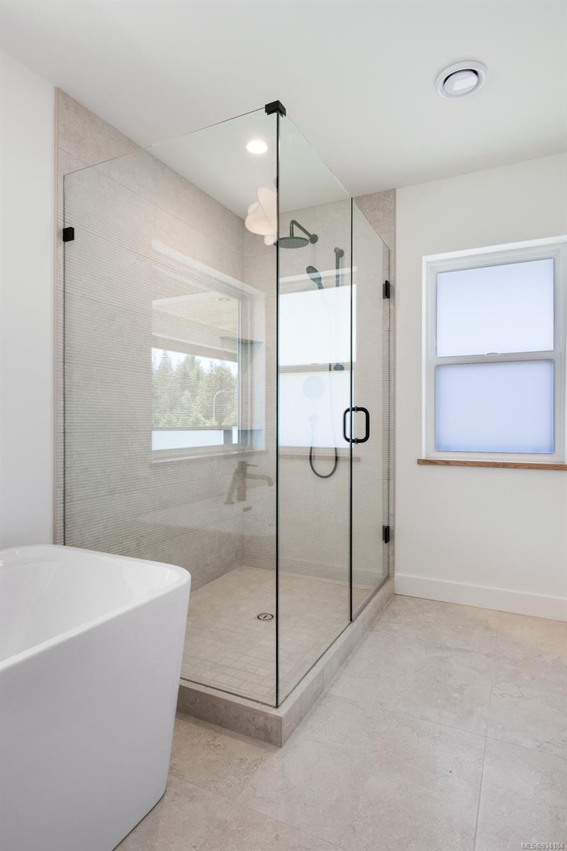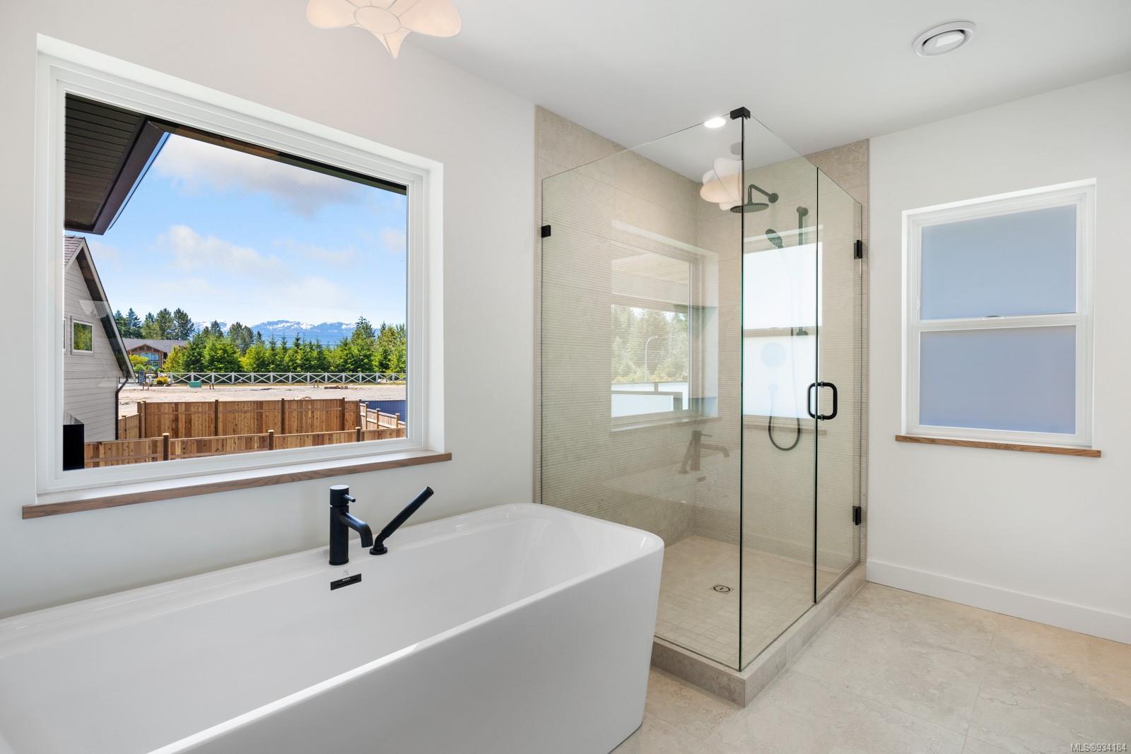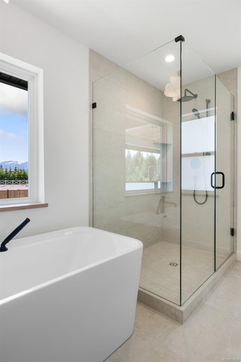 Upstairs you will find a tiled laundry room, two front facing bedrooms with coastal mountain views and Burber carpet throughout. The primary suite is large and sunny and features its own covered patio with mountain views and privacy glass. The ensuite includes heated tiles throughout, walk in tiled shower & gorgeous stand alone tub.