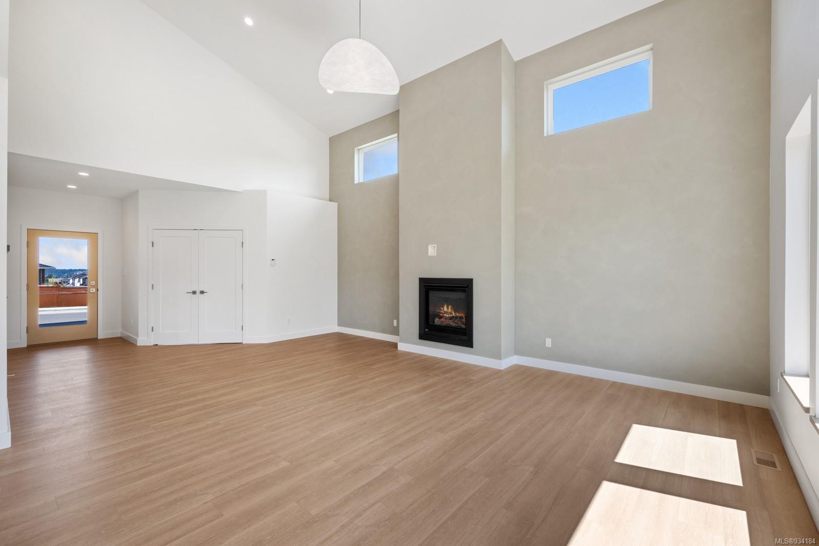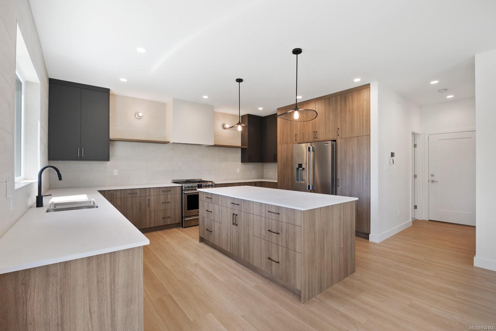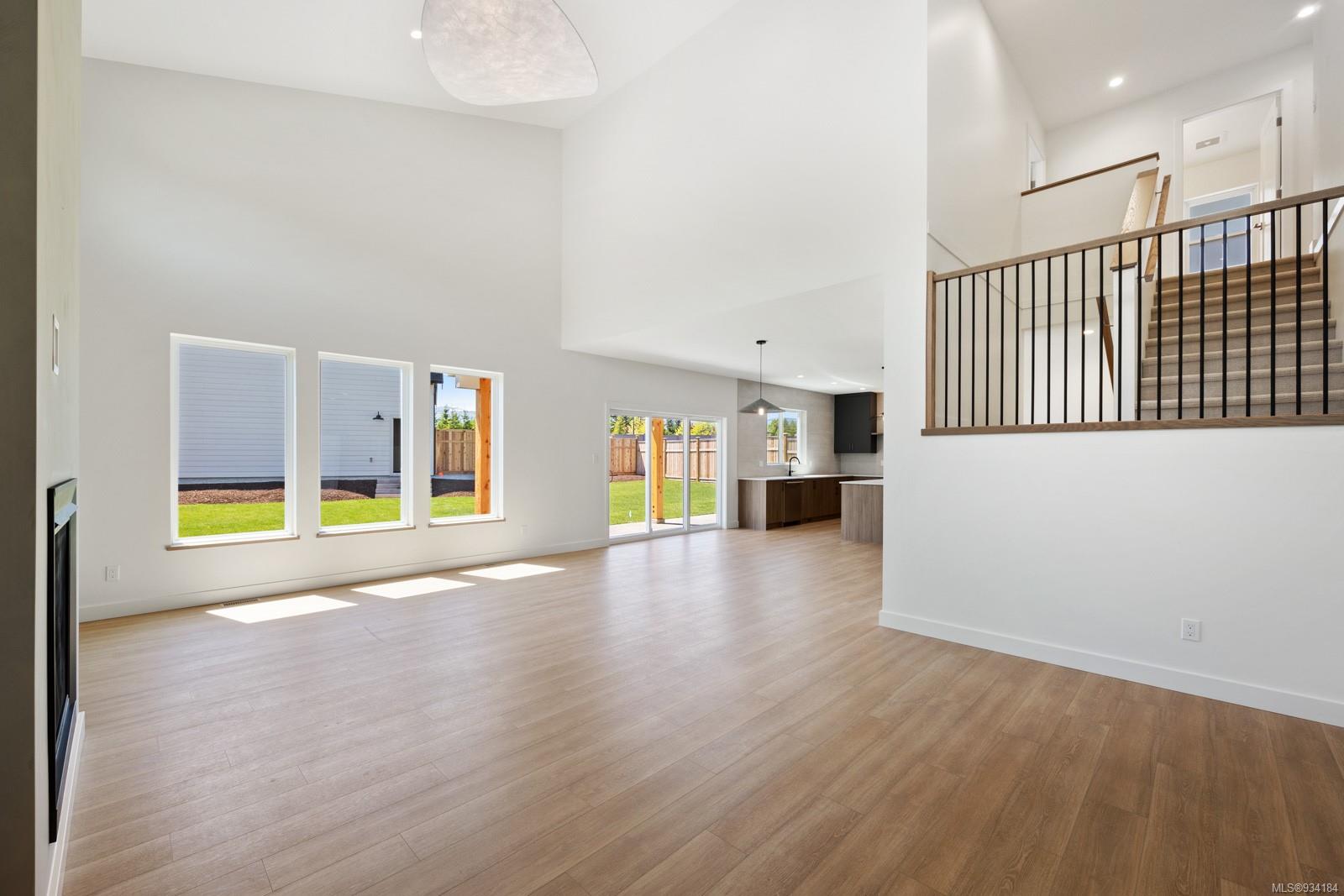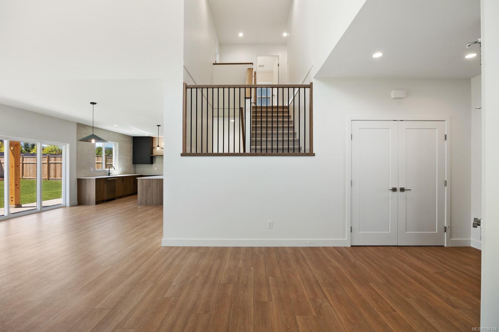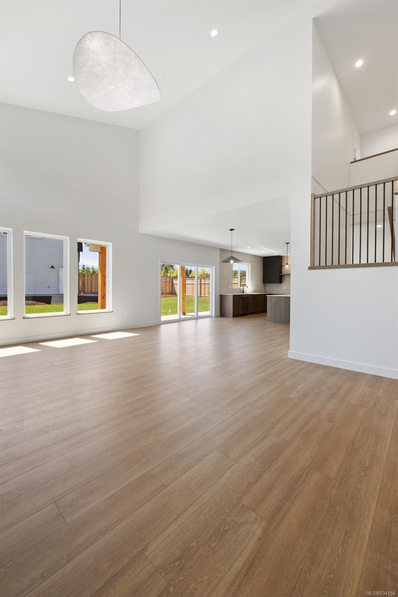 Through the main entrance you’ll find a great room with 17 ft ceilings and lime paint feature wall with gas fireplace. Vinyl plank flooring throughout provides a family friendly elevated feel. Behind the french doors lies a large den or office space and the open concept dining area includes slider doors to the spacious half covered half sunlit deck outside. The modern kitchen features quartz countertops, a stainless steel appliance package and countertop to ceiling tile backsplash. Access to the garage is from the main floor.